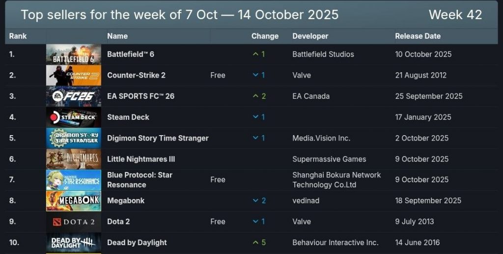 بازی Little Nightmares III در میان ده بازی پرفروش هفته است که در رتبهی پنجم قرار گرفته است. بازی EA Sports FC 26 با دو پله صعود به رتبهی دوم رسیده، Steam Deck با یک پله سقوط در جایگاه سوم قرار دارد،و Digimon Story Time Stranger نیز با یک پله کاهش به رتبهی چهارم منتقل شده است.