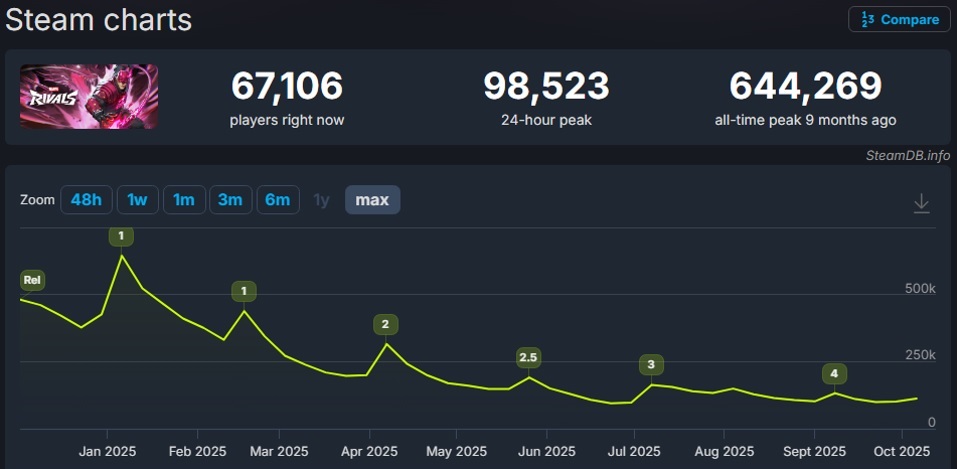 بازی Marvel Rivals اثر شرکت NetEase با یک فهرست از شخصیتها و انیمیشنهای فوقالعاده عرضه شد. مکانیکهای این اثر عمدتاً از بازی Overwatch گرفته شده بودند. با این حال، تعداد بازیکنان این بازی در Steam، در کمتر از یک سال، ۸۵ درصد افت داشته و از ۶۴۴,۰۰۰ بازیکن همزمان در اوایل سال ۲۰۲۵ به ۹۸,۰۰۰ بازیکن رسیده است. البته ۹۸,۰۰۰ بازیکن همزمان هنوز هم در مقیاس امروز صنعت بازیهای ویدیویی خوب به نظر میرسد، اما مشکل اینجاست که خط روندش همچنان نزول است و به نظر نمیرسد به یک نقطه کف رسیده باشد. از دست دادن این تعداد بازیکن در این مدت کوتاه به هیچ عنوان برای اینکه Rivals در درازمدت موفق شود، نشانه خوبی نیست، به ویژه اگر هزینههای تولید بالا باشد و روند سریع انتشار شخصیتهای جدید هر ماه ادامه پیدا کند.