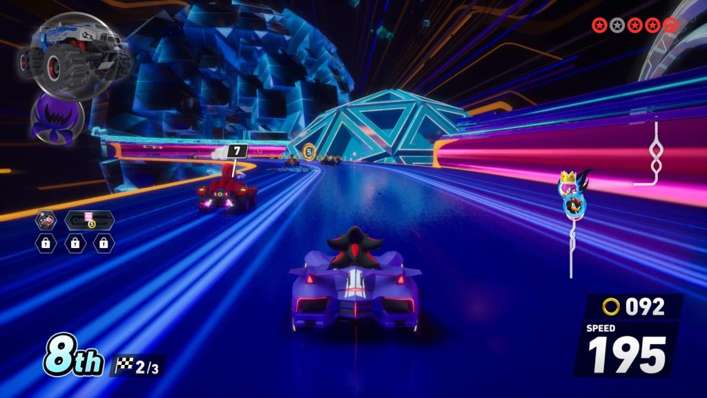 یعنی هر مسابقه سه دور دارد. دور اول که تمام شد، نفر نخست باید از بین دو پورتال که به پیستی متفاوت ختم میشود، یکی را انتخاب کند و رانندهها به درون دنیایی دیگر کشیده میشوند. برای دور سوم نیز همه دوباره به پیست قبلی بازمیگردند که حالا دستخوش تغییراتی هم شده است. هر دور هم که تمام میشود، موسیقی اندکی تغییر میکند و ریتم سریعتر و هیجانانگیزتری پیدا میکند. در مجموع خستهشدن از مسیرهای مسابقه در Sonic Racing راحت نیست.